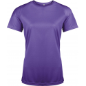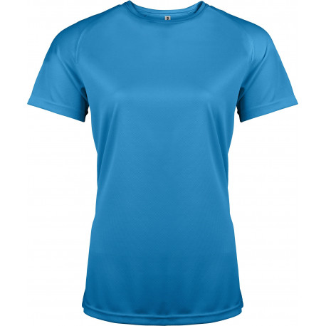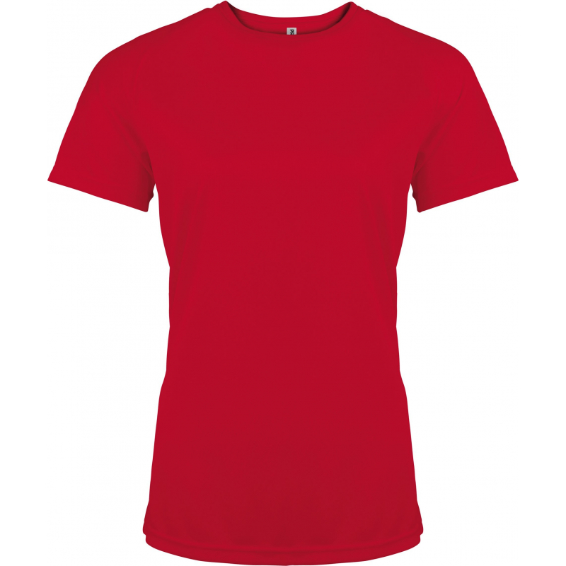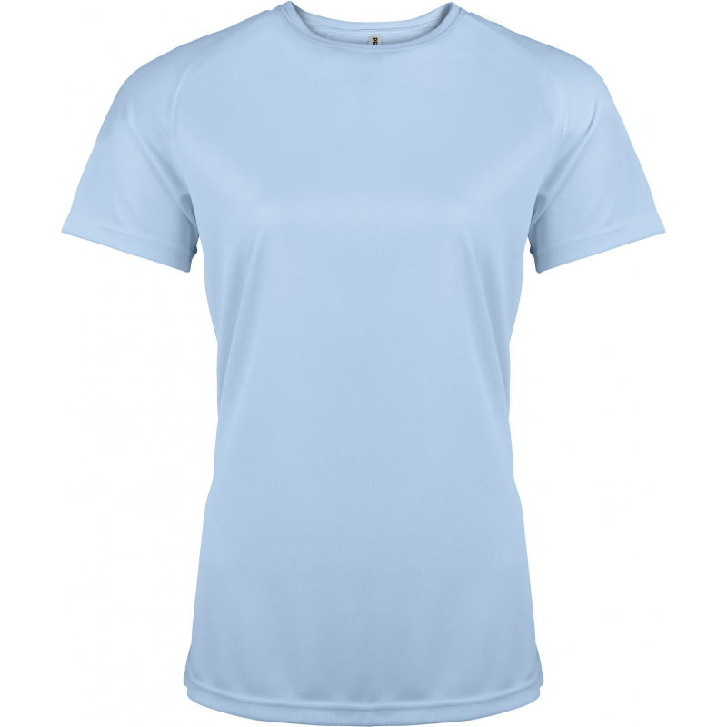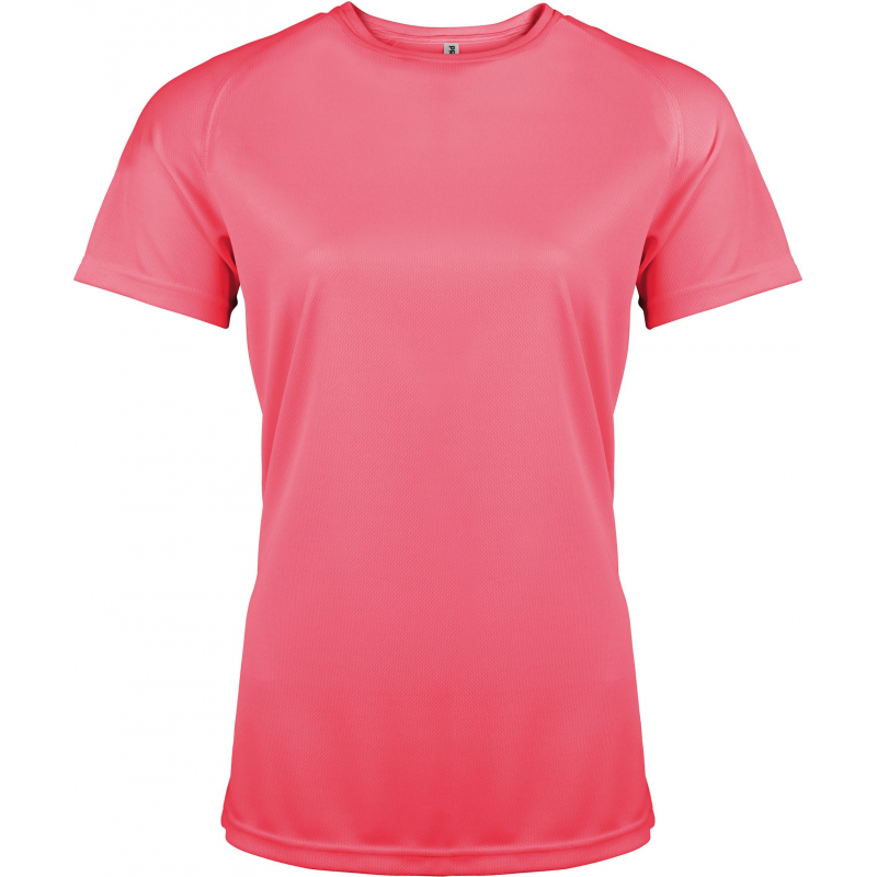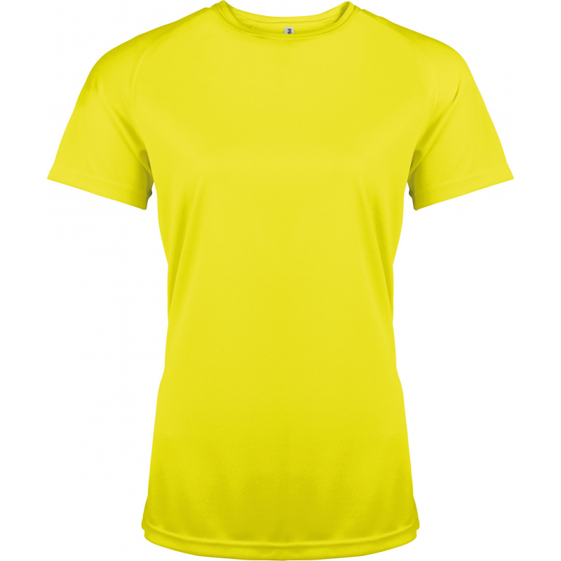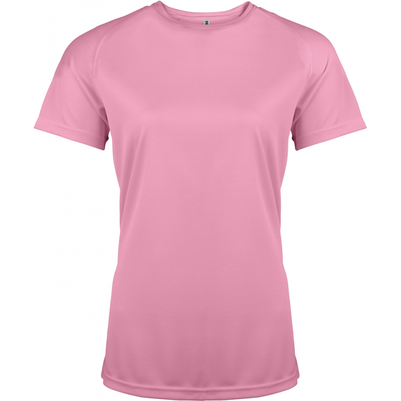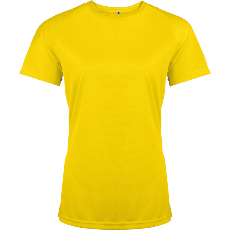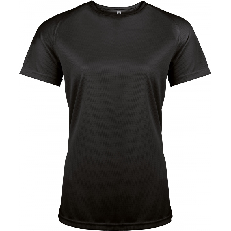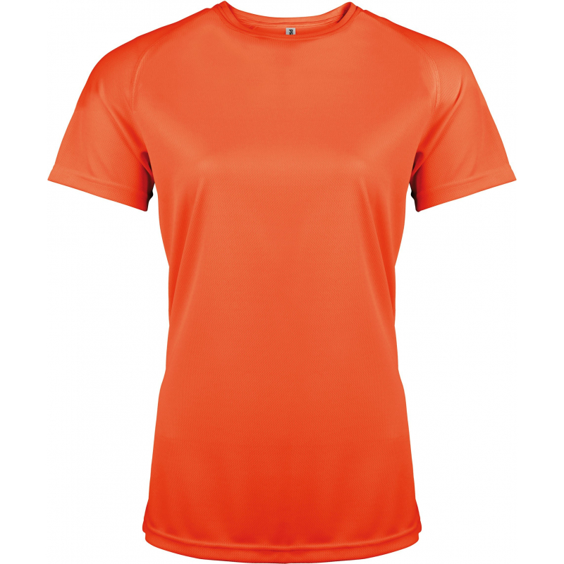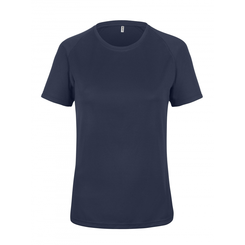 100% polyester. Tissu léger à séchage rapide. Encolure ronde avec bande de propreté. Manches raglan avec points de recouvrement. Finition double aiguille à l'encolure, bas de manches et de vêtement.
